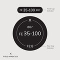 - Rear indicators feature the filter size, focal length, aperture & lens designations.