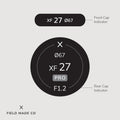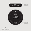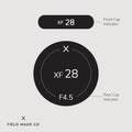 Each label, sold separately, includes a front and rear cap indicator for Viltrox - Fujifilm XF lenses, displaying focal length, aperture, filter size, and lens designations. Crafted in Montreal, Canada, from durable, UV and scratch-resistant matte vinyl from North America with outdoor rated adhesive, these indicators offer lasting performance and a sleek, professional appearance.